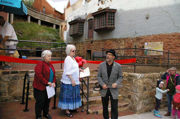 On Tuesday, August 3, Central City commemorated the opening of the Belvidere Pocket Park with a ribbon cutting ceremony. The park was constructed in the vacant lot between City Hall and the Belvidere Theatre buildings transforming an unsightly mound of dirt, weeds, and rock into a beautiful respite. Barbara Thielemann gave a short speech as representative of The Belvidere Foundation reporting the funding obtained by grants awarded to the City. Betty Mahaffey then thanked the various people involved that allowed the project to happen. Mayor Jeremy Fey followed by proudly cutting a large red ribbon barricading the entrance with an over-sized pair of scissors. The opening was attended by about 50 people who were serenaded with electric piano played by Dutch and enjoyed Italian espresso provided by barista Steve.