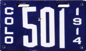 For many years, Colorado’s license plates bore the slogan “Colorful Colorado” in reference to the state’s natural beauty. But, just as colorful is the history of the license plates themselves. Colorado first required owners to register their vehicles with county clerks in 1910, but provided no specifics for doing so. Vehicle owners had to come up with their own numbers, and some used their addresses or ages, while others used random numbers that simply occurred to them. After registering with clerks, owners also had to make their own license plates, with some attaching house numbers to their cars wherever they thought most appropriate, while others fastened numbers to leather or wooden tags that hung from the rear axles. The first state-issued license plates (white porcelainzed metal with black numbers) came in 1913. The state switched to steel plates in 1916, and continued to issue new plates every year, allowing motorists to keep the same numbers if they wished, which led to heated competition among drivers to get low-numbered plates when they ever became available. Denver oilman and politician E.E. Sommers, for example, had license plate number 1 for many years prior to his death. His wife then took it over, until it was issued to future Gilpin County resident Emily Griffith in 1931.