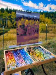 The mercury hung at 30 degrees as early morning sunshine cascaded through Gregory Gulch embracing leaves of yellow, orange and red, on Friday, September 27. A handful of early morning travelers squinted into the sun during their descent making it difficult to discern the bundled beings striking a pose gazing carefully into the distance with brushesin hand. Adjacent to the Century Casino garage, pastel artist Virginia Unseld held a steady brush using a less familiar oil medium to reproduce the glory of the early morning sun lighting the hillside, before her line of sight would be obstructed when the morning buses park to await their next run. Unseld, and many other artists, began producing scenes around town to silently herald in the second annual Plein Air Festival sponsored by the Central City Opera.