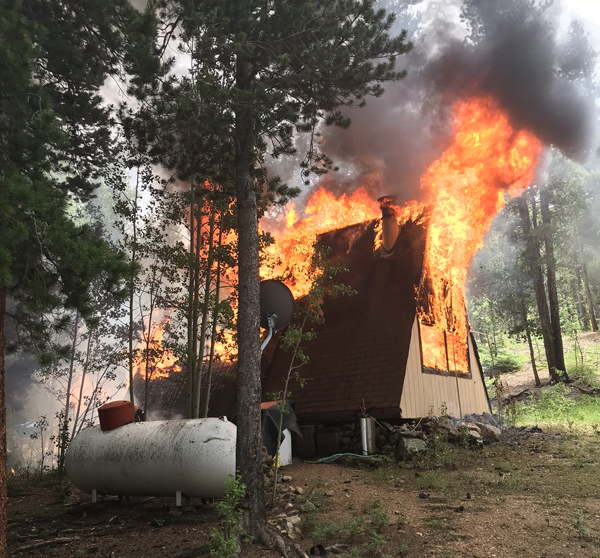 At 11:55 a.m., Friday July 12, a Timberline Volunteer Fire Fighter called in a concern seeing smoke, followed by a 911 call in the area of Blue Spruce Road and Highway 119, near Roy’s Last Shot. Without details of the fire, Timberline Fire responded with a command vehicle, two fire engines, two water tenders, and two Type 6 brush trucks with limited water supply on each. This was a large variety of apparatus, but with no confirmation of the type of fire the department was responding to, it was necessary to cover all the bases.