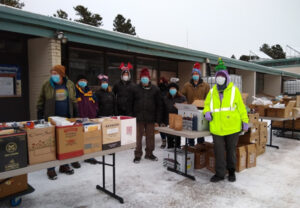 Families, volunteers, and the community helping others with food and resources