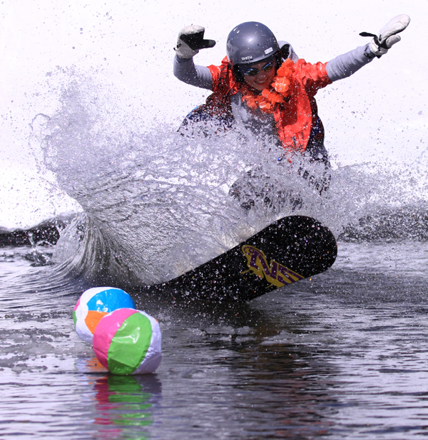 With only eight more days left of the ski season, Eldora Mountain Resort turned the fun up a notch hosting their 2nd Annual Pond Skim. Eighty entrants would try to make it all the way across one of two ponds or suffer the consequences. Chunks of ice were raked from the water before the proceedings began and everyone who had signed up was required to wear a helmet. The wind gusted 30 mph and the thermometer sat stubbornly at 25 degrees. As is often the case with crazy events, costumes were encouraged. The Mad Hatter, a hockey player, a pimp, a couple of pineapples, and people dressed in leis and Hawaiian shirts as well as those with no shirts at all braved the chilly challenge. Half of them glided from one side to the other while the rest weren’t quite so lucky and took the icy plunge. Flips and spins earned bonus points even if it meant getting soaked. Any excuse for awarding a prize, including best wipeout, was considered; fifteen skimmers won gift bags.