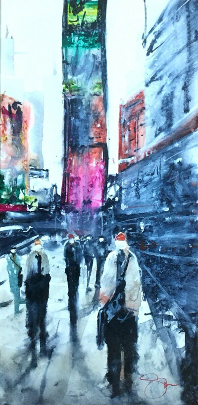 In the midst of the COVID-19 global pandemic, Denver artist Steve Griggs painted this watercolor cityscape on canvas depicting people walking in a downtown area, appropriately spaced, and wearing face masks. This is an unprecedented time in history and we felt it needed to be documented in his art. As we do our part by staying home, we want to contribute what we can to those who are suffering from financial hardship. Food insecurity is a real problem. Even more so during this time of unemployment and income loss. As such, we have chosen to use Steve’s art to support World Central Kitchen who in turn supports those in need.