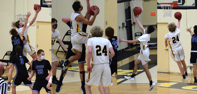 The Gilpin Eagles boys’ varsity basketball team played their final two games of the season last week finishing with a loss in overtime in one game, and a decisive win in the other. The home game against the Lyons Lions opened with Senior Night and ended with hard fought overtime play action. Only pre-selected spectators were allowed to attend the home game. The team’s final game was played in Longmont, Colorado versus the Twin Peaks Charter Academy (TPCA) Timberwolves and concluded the Eagle’s season with a solid win. Spectators were not allowed to attend the TPCA game due to that school’s COVID restrictions.