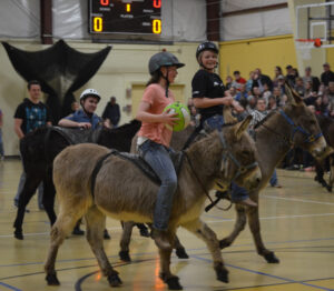 Donkeys are well known for being work animals – for being used for transportation and for carrying goods. Sometimes, though, they get to have a little fun. That was the case on Wednesday evening, April 18, when eight of them visited Gilpin County School for an entertaining “Donkey Basketball” fundraiser to solicit donations for the eighth and twelfth grade classes. A pulled pork dinner kicked off the evening, and the games followed in the school’s old gym.
