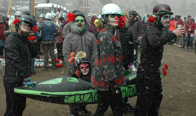 Driving into Nederland, CO on Saturday, lines of cars were parked along the highway for a mile leading into town. If you didn’t know already, the 17th annual Frozen Dead Guy Days festival was taking place, and there were throngs of people for as far as you could see from Hwy 119 all the way down to Guercio Park by Barker Reservoir, and on every other highway leading into town from Boulder and Estes Park. Finally locating a parking spot, I parked the Jeep and strolled down East 1st Street, taking in all the sights and sounds. Even with the falling snow and chilly temps, there were poets espousing prose from makeshift stages, frozen turkey bowling in the street, beer tents and live music along both sides, and interesting people of all ages and walks of life to talk to. Young families had their kids in strollers, while other couples walked along with their dogs. There were plenty of uniformed officers helping folks with traffic, and ensuring that alcohol consumption rules were being followed. Passing the chainsaw art vendor area, we were enticed to stop and check out all the great art created from trees – far surpassing the typical touristy type of bears. Making my way on down to the park, there was a large arena circled with vendor wagons and many types of tasty food and frosty beverages, as well as live bands playing in heated tents. Once past all that, you could hear the roar of the crowds as costumed individuals braved the icy waters of the Polar Plunge. Immediately following that watery fun, the coffin races started, with many costumed teams entering, and bystanders were packed in 6-10 people deep all the way around the race course.