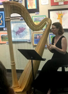 In these tumultuous political times and sweltering weather, it was a pleasure to gather Wednesday evening at the Gilpin Library, where harpist Kathryn Harms treated the assembled group to “A Weekend in New York.” First stop was afternoon tea at the Waldorf-Astoria Hotel. The soothing sound of the harp is perfect classy background music (high tea costs $68, but our refreshments were free). In a medley of romantic and big-band tunes, Kathryn voiced the easily identifiable melodies with precision, while rich dense arpeggiated harmonies of jazz-inspired added-seventh chords reverberated from her echoing ringing strings.