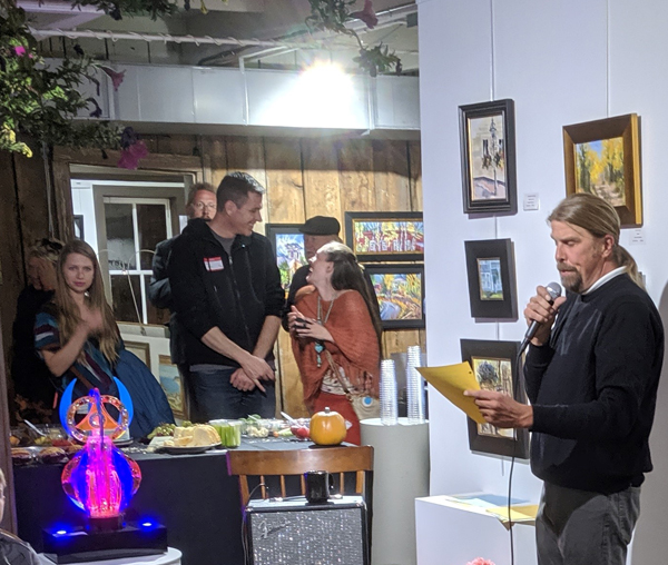 The Gilpin County Arts Association is entering its 73rd year and promotes the longest, continuous juried art show in the State each spring. Their historically glorious art gallery located in Washington Hall has been without heat up until 2018 when a heating system was installed in cooperation with the City of Central and several generous donors.Now the Association is adapting to a year-round schedule with the challenging of funding the cost of year-round utilities. On October 12, they held their annual fundraiser to help pay for the year-round costs. Gallery Manager Michele Scarduzio has done incredible work juggling the artists, art, and media for the gallery bringing together professional and highly-skilled shows. Together, with the Art Board and her assistant manager, Aileen Tamai, the association continues to produce excellent exhibits and events that enrich the community. The fundraiser added elements of fun with a wall of wine, silent auction, and mystery grab bags. The grab bags are valued at $50 or more and sold at half the price. For a $20 donation, you got to dip your hand into the working sluice basin and draw a rock with a number on it. Each number corresponds to a bottle of wine which goes home with the lucky number drawn. The silent auction had many excellent pieces of art and meals at fine dining establishments in Black Hawk.