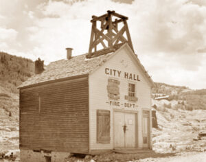 One of the original pioneers of Nevadaville, and town business leader, was Truman Whitcomb. He purchased property on the southwest side of Main Street in 1870, and built a stamp mill known as the Whitcomb Mill Company. Sometime before his death in 1883, Mr. Whitcomb built a frame two-story building on a lot, just east of his mill. Whether or not this building was used as a house, is unknown, but highly probable. Late in 1883, the estate of Truman Whitcomb sold the lot and frame building to the Town of Nevadaville for $150. The frame building would become the Nevadaville Town Hall.