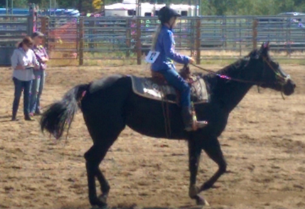 Saturday, July 22nd at the Gilpin County Arena, 16 riders and horses participated in the second of three summer horse shows sponsored the by Peak to Peak Healthy Communities Project. It also has generous support by United Power and a sponsorship by The Mountain-Ear, Nederland Equestrian School, and Ridgeline Consulting. Promptly at 9:00 am the judged riding events began. Previously, most riders had unloaded, prepared and warmed up their horses in the clean arena with only a couple puddles from our recent rains near the announcer’s tower. Some riders shared horses in different age groups, though sharing a horse in the same age group did not give an official score points for the second rider. One rider had two horses, the first to earn points for the cherished buckle, and the other was to practice and train the horse for future competitions.