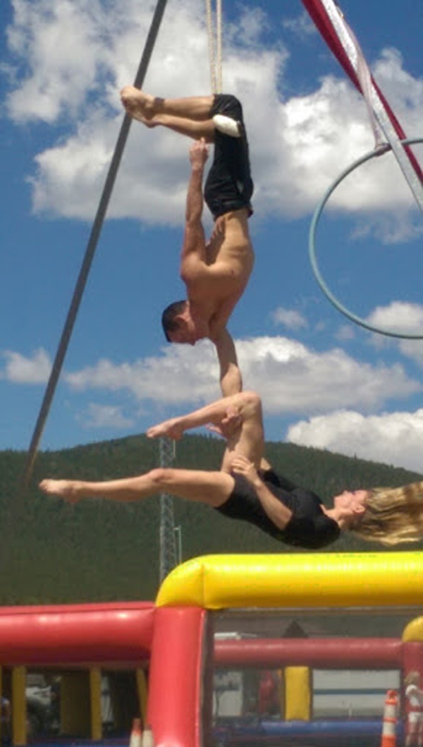 Salida Circus from the San Luis Valley in southern Colorado brought happiness and joy to the Gilpin County Fair. Jacob, Addison and Vea – three volunteer local children, enjoyed watching the performers getting decked out in clown collars, noses, spinning plates, hoops and juggling pins on foot stands to the music of the William Tell Overture. The performers demonstrated amazing aerial skills, some ukulele singing, juggling, a dog doing tricks, and young dog trainer telling jokes accompanied by an old type of small squeeze accordion, stilt walkers and Uncle Ed the balloon twister. The entertaining show was very hometown charming.