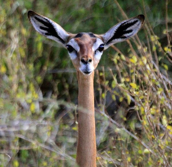 In Northern Kenya, amongst arid scrub desert bordering the Ewaso Ng’iro River, lies Samburu National Reserve. It and the adjacent reserve Buffalo Springs are home to an unusual and rare group of animals viewed only in Northern Kenya, Ethiopia, and Somalia. They are known as “The Special Five:” Somali ostrich, Grevy’s zebra, beisa oryx, reticulated giraffe, and gerenuk. Samburu N.R. was one of the locations that Elsa the lioness of “Born Free” fame spent part of her life.
